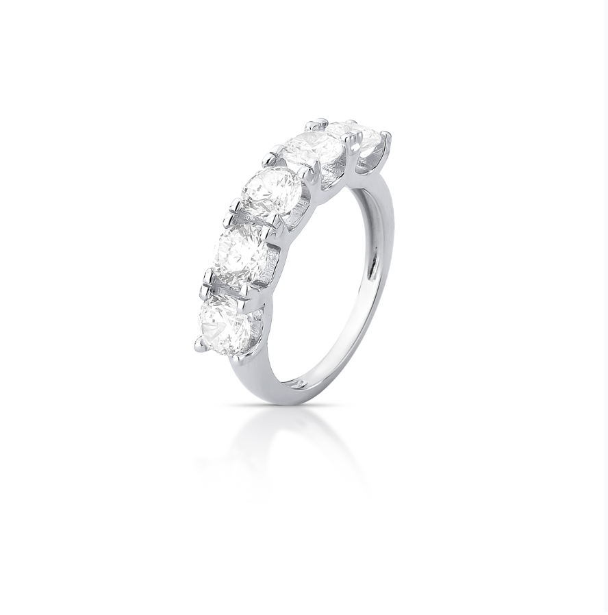 O Anel Meia Aliança com 5 pedras redondas de 5mm é uma peça que transmite sofisticação e presença. Suas pedras são fixadas em 4 garras, proporcionando mais segurança e valorizando ainda mais o brilho individual de cada pedra.