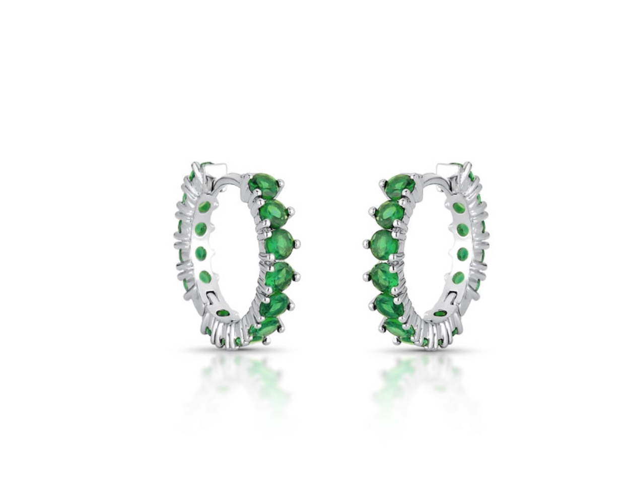 Brinco argola modelo Riviera com pedras redondas de 3mm, brilho intenso e acabamento impecável no ródio branco. Leve, moderno e perfeito para uso diário ou para elevar qualquer produção.
