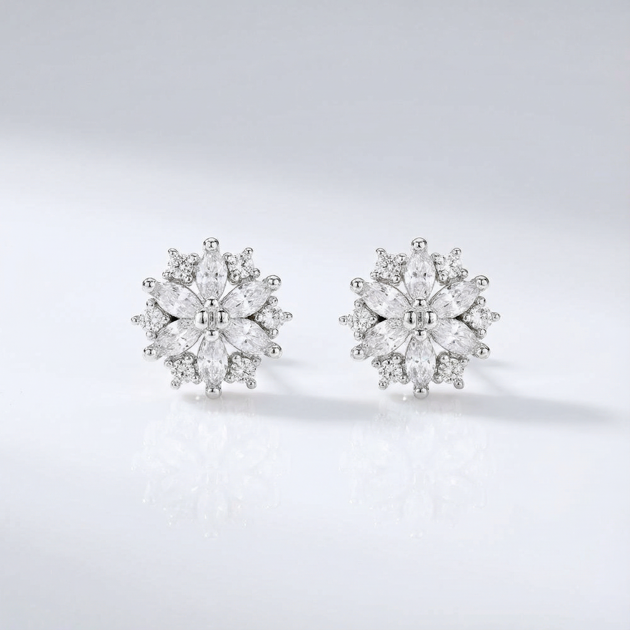 Brinco delicado em formato de flor, com seis pétalas em pedras navete e pontos de luz na lateral, que garantem brilho e sofisticação na medida certa. Confeccionado em Prata 925, é uma peça elegante e versátil, perfeita para o dia a dia ou ocasiões especiais.