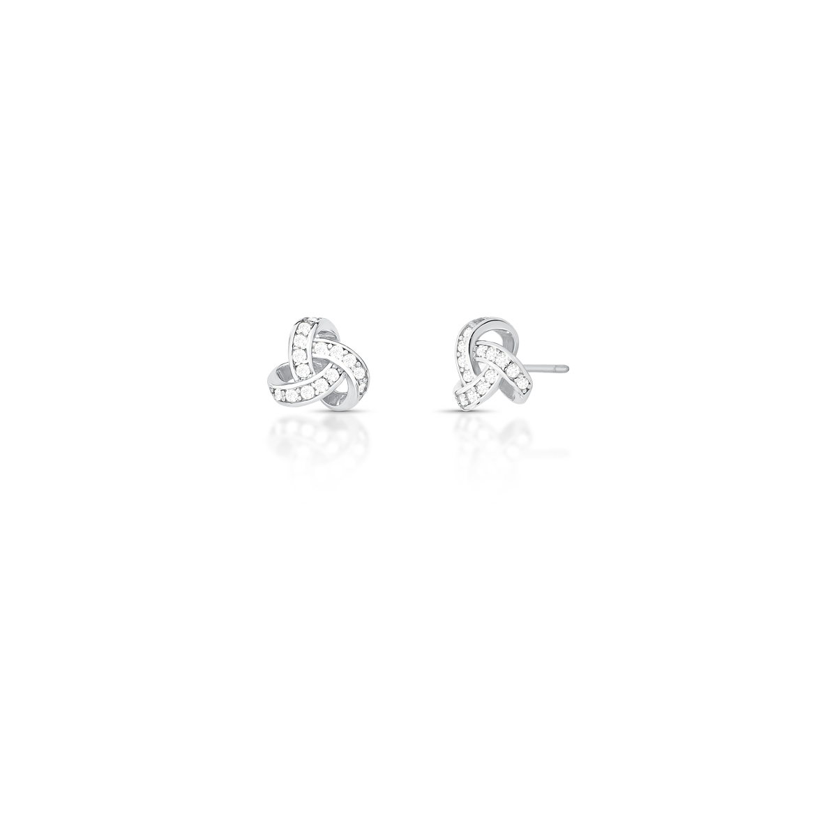 Brinco Nó de Amor em ródio branco de excelente qualidade, com design entrelaçado e cravejado em zircônias. Elegância e significado em uma peça atemporal.