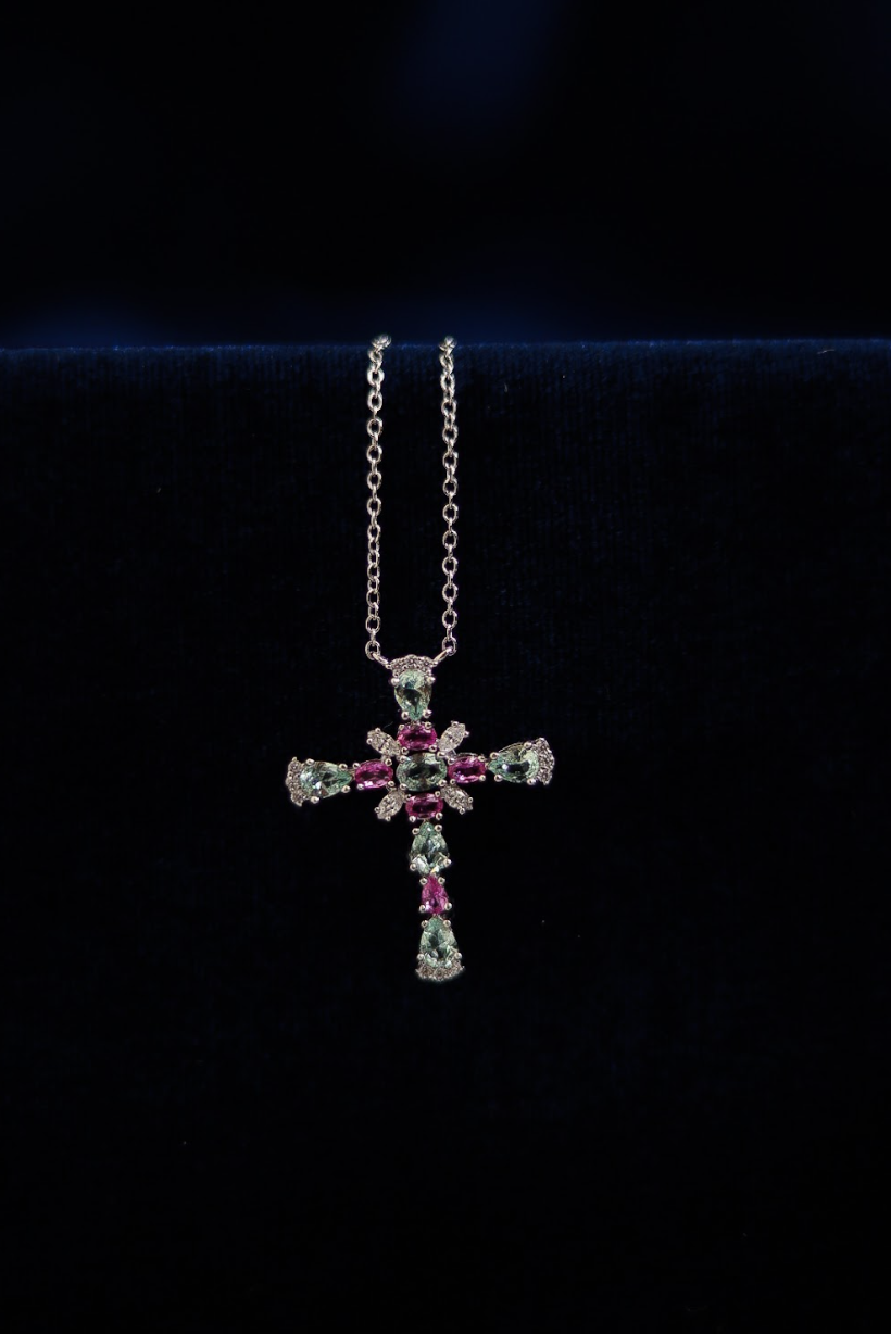 Um colar delicado e cheio de significado, confeccionado em Prata 925 com pingente de cruz formado por zircônias coloridas em lapidações gota, oval e navete, proporcionando brilho intenso e um visual moderno.