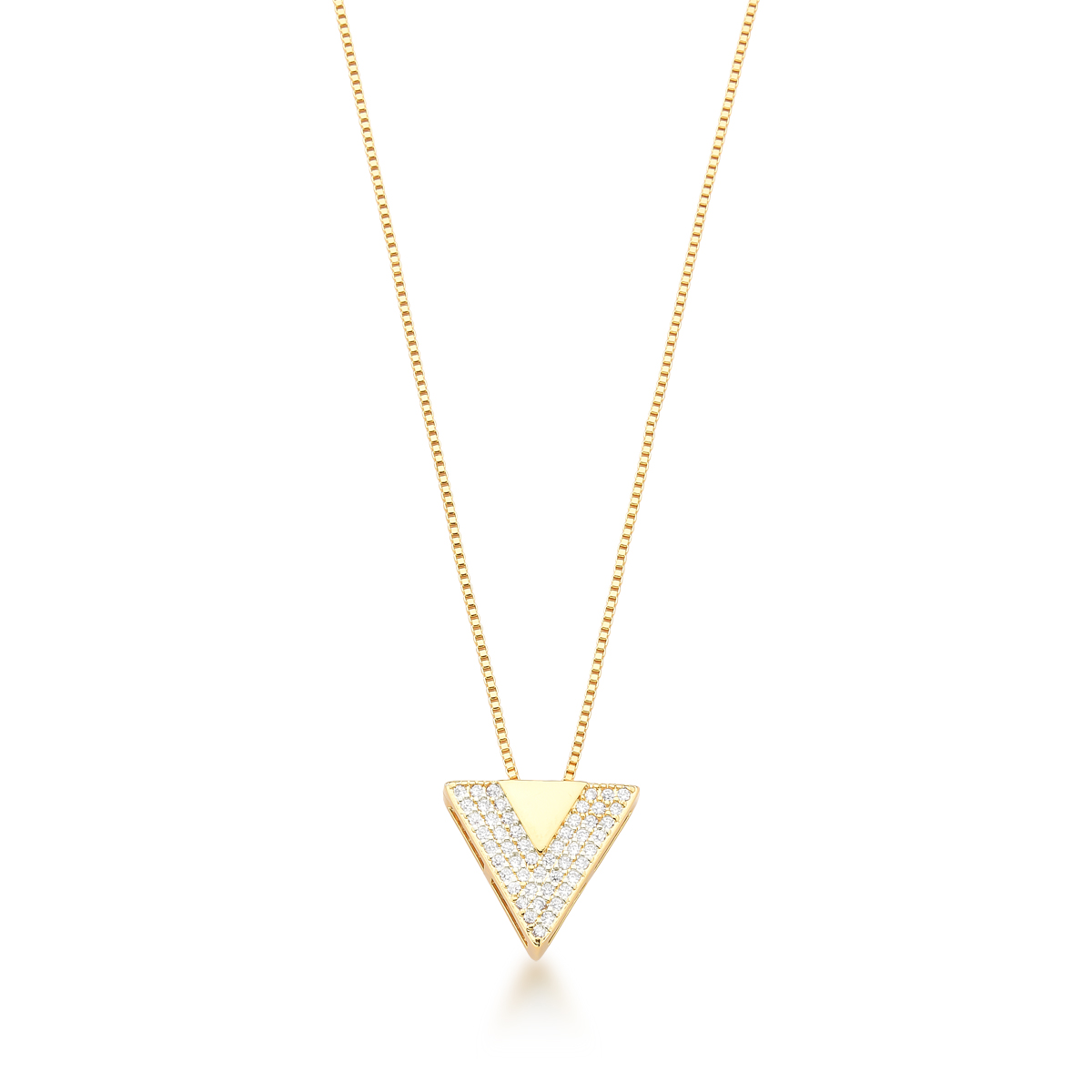 Colar delicado com pingente triangular vazado, cravejado com três colunas de zircônias incolores que trazem brilho e leveza ao design.