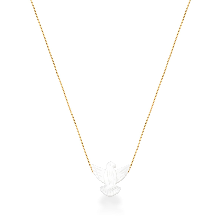 O colar com pingente do Espírito Santo em madrepérola traz um brilho suave e sofisticado, combinado com o acabamento dourado que valoriza ainda mais a peça. Delicado e cheio de significado, é perfeito para quem gosta de acessórios com propósito e elegância.