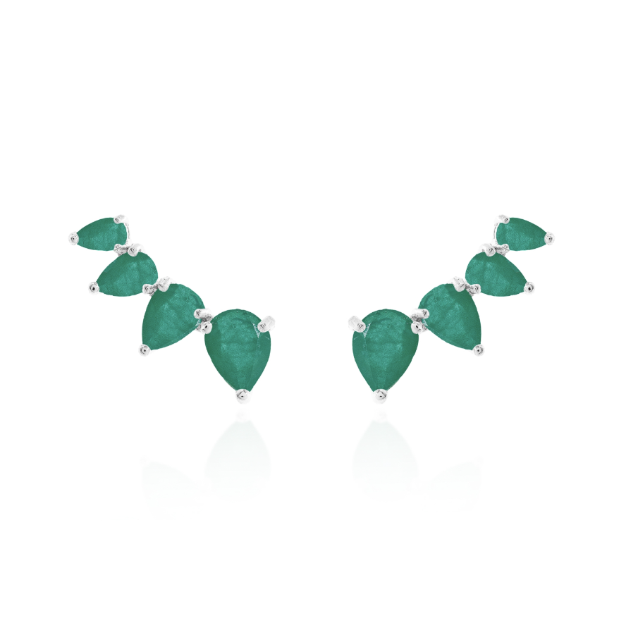 Produzido em metal com banho de ródio branco, ele apresenta quatro zircônias em lapidação gota na cor esmeralda, posicionadas em ordem decrescente para criar um efeito sutil e harmonioso na orelha.